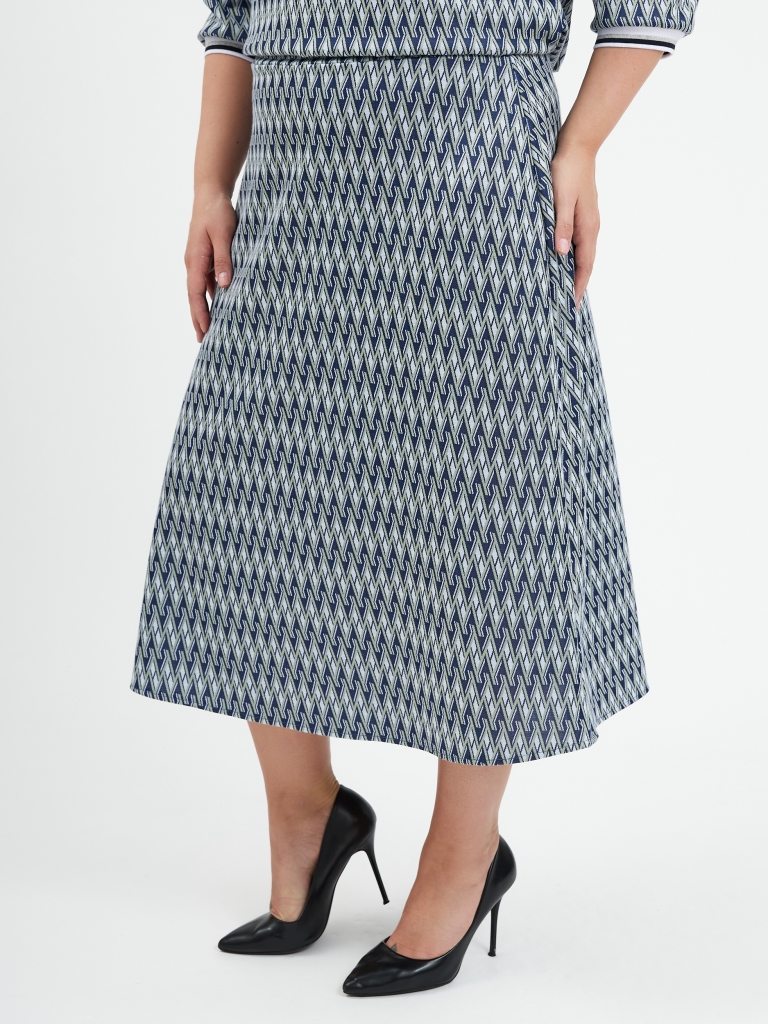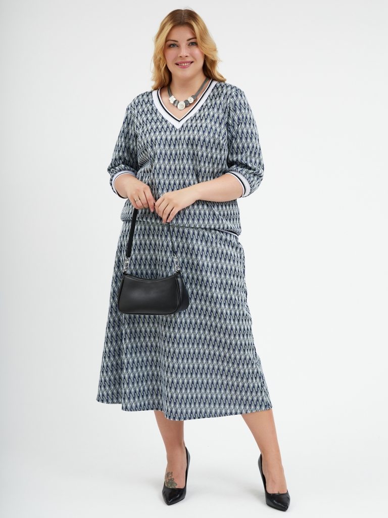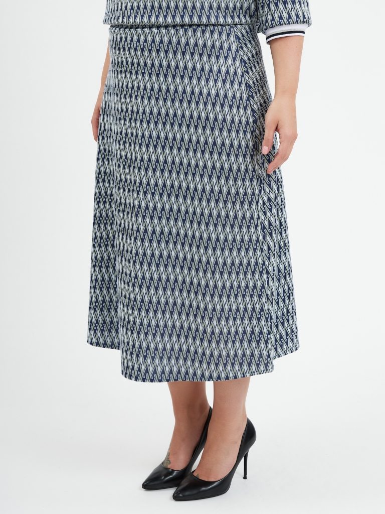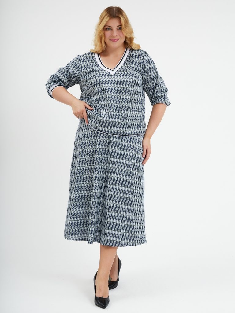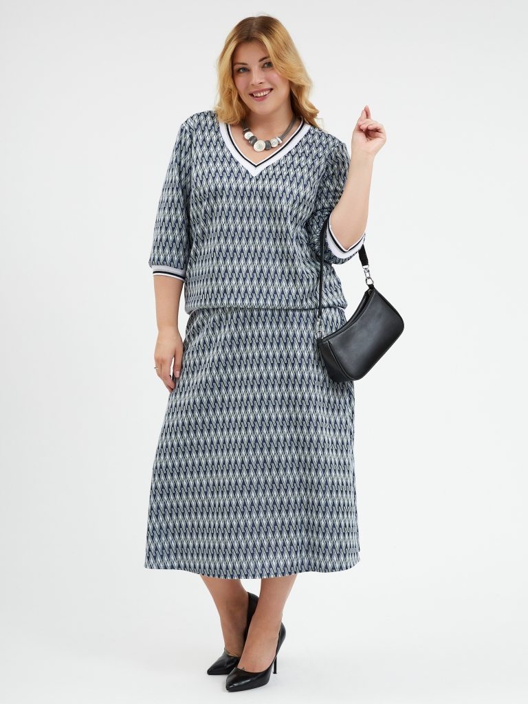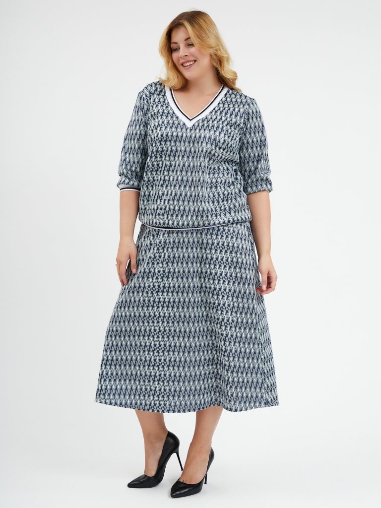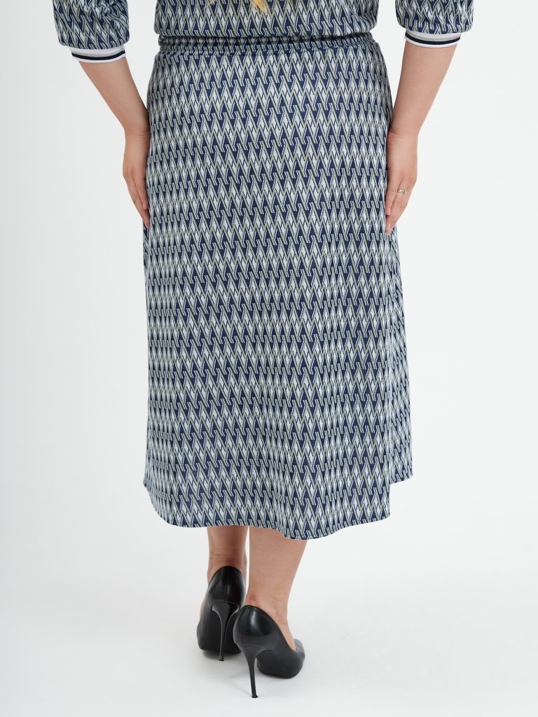 Краткое описание76030 Юбка. Цвет: синий/оливковый. Состав : ПЭ 65%, вискоза 32%, спандекс 3% Трикотажное полотно. Юбка - силует трапеция, без карманов. Юбка с высокой посадкой визуально удлиняет ноги и делает силуэт более стройным.